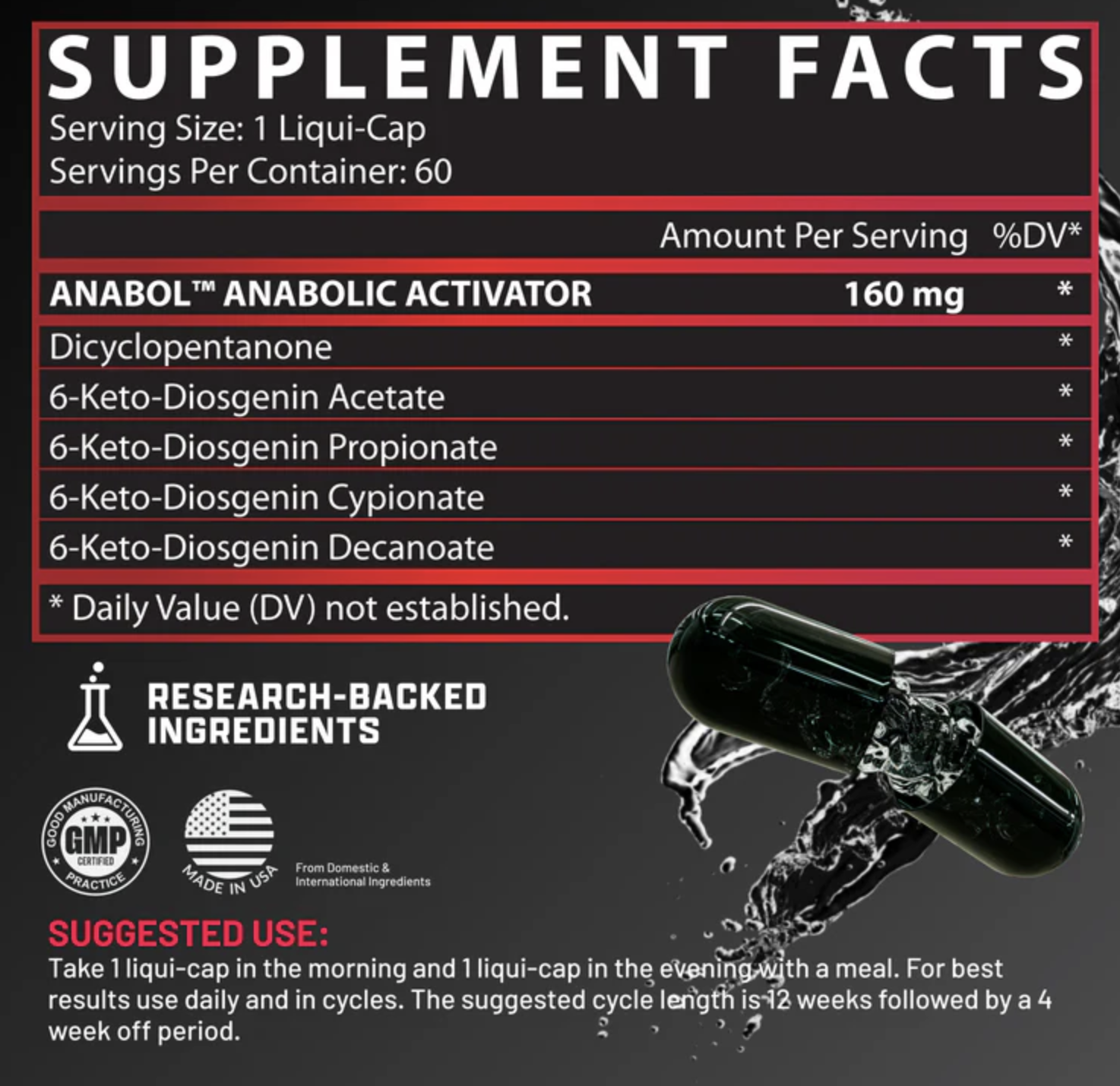 To help ensure optimum effects, ABOL comes in fast-absorbing liquid capsules. ANABOL is best taken in cycles, 12 weeks on, 4 weeks off.