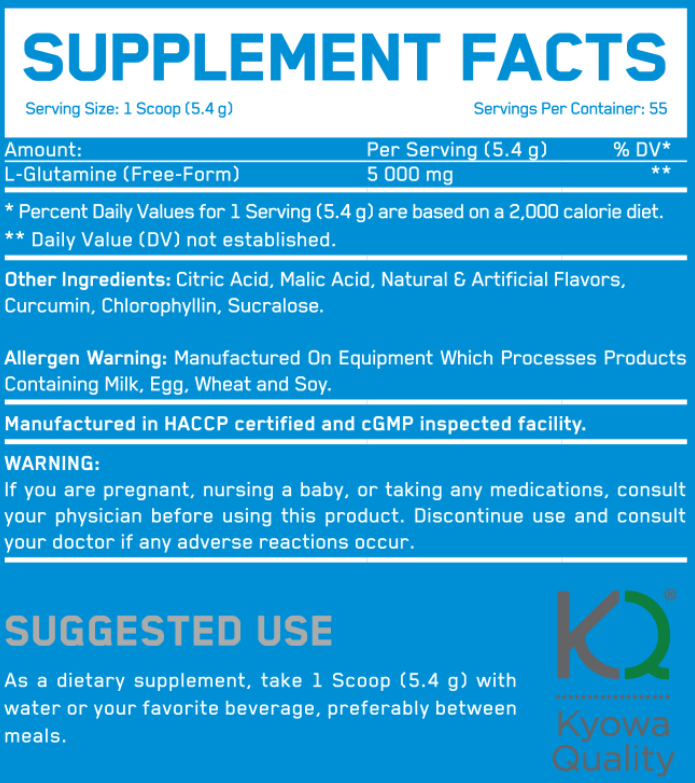 In this product we used KQ (Kyowa Quality) Glutamine. Kyowa Quality (KQ) is formed from a good range of ultra-pure amino acids and related compounds, exclusively provided by Kyowa Hakko BIO Co. LTD., a true worldwide leader with over 60 years of experience and a reputation for strict quality assurance.