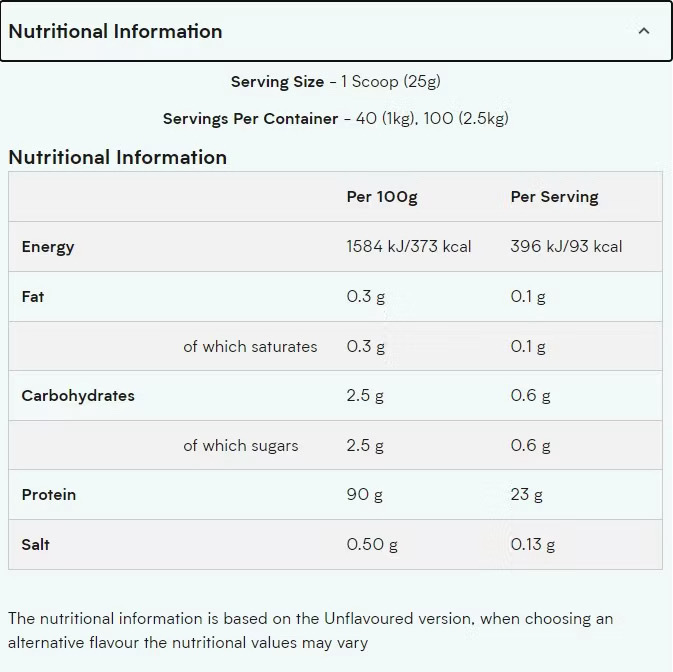 *Heads up, these details are based on unflavoured Impact Whey Isolate. The nutritional content may vary based on the flavour you choose.