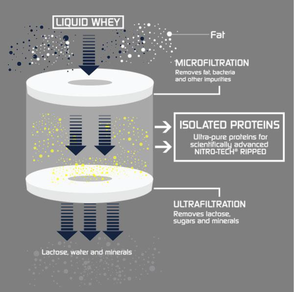 Each scoop of NITRO-TECH® RIPPED contains 30g of protein, primarily from whey protein isolate and whey peptides. The whey protein in NITRO-TECH RIPPED has been filtered using Multi-Phase Filtration Technology for less fat, lactose and impurities than cheaper protein sources. Furthermore, NITRO-TECH RIPPED is manufactured according to GMP standards, as is required for all natural health products to ensure quality and integrity.