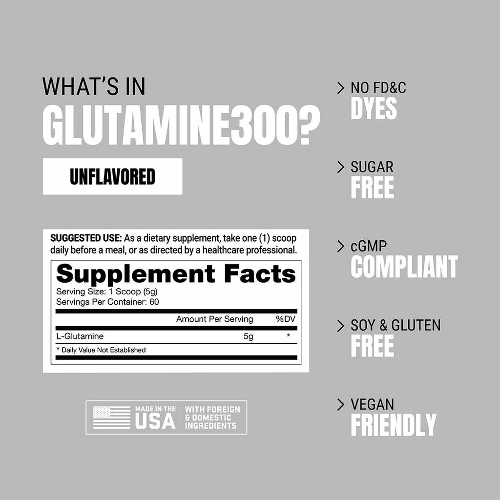 Give your muscles the fuel they deserve to reduce muscle breakdown and speed up recovery time. Typically used pre and post-training to support muscle maintenance and recovery, this superior-grade Glutamine 300 is designed for men and women looking for a high-quality Glutamine product to increase their athletic performance through enhanced recovery and well-being.† Glutamine 300 powder has no added sugars, no fillers, no FD&C dyes, and is gluten-free.