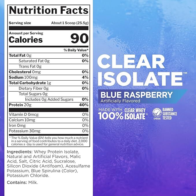 Made with a specialized type of isolated whey, each crystal-clear serving delivers 20 grams of protein and over 9 grams of essential amino acids (EAA), without any gluten, fat, sugar, or cholesterol. To further support your active endeavors, Clear Whey Isolate provides 5 electrolytes to assist hydration and is Informed Choice tested for banned substances. ^^